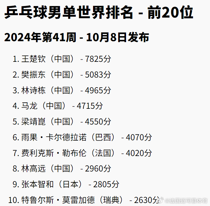 让我们来欣赏最新的乒乓球全球排名,感受世界各地乒乓球高手的竞技风采,从东方的中国到西方的欧洲,再到南美的巴西,乒乓球已经成为一项世界性的运动,这个排名,就像一张世界地图,指引我们开启乒乓之旅。