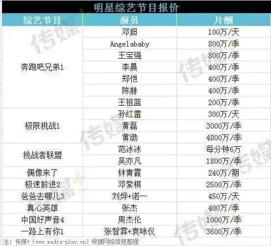明星片酬排行榜具体排名揭示